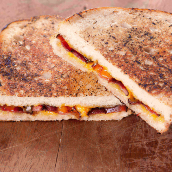 Grilled Dubliner Cheese, Bacon, Dill Pickles, and Honey Sandwich
