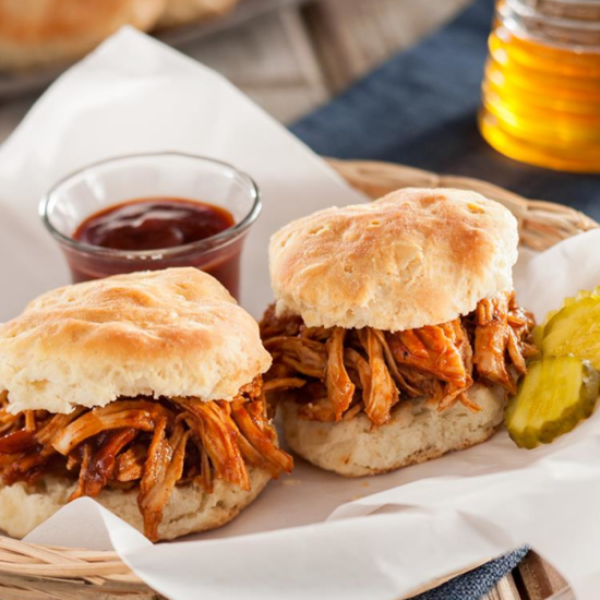 Honey BBQ Pulled Chicken on Buttermilk Biscuits