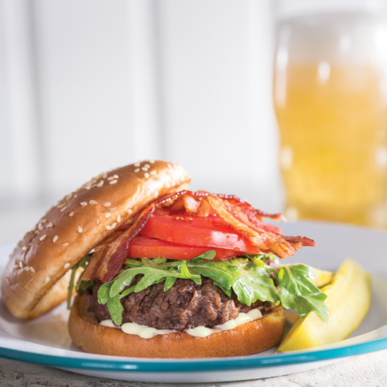 Peppered Asiago Bacon Burgers with Honeyed Arugula